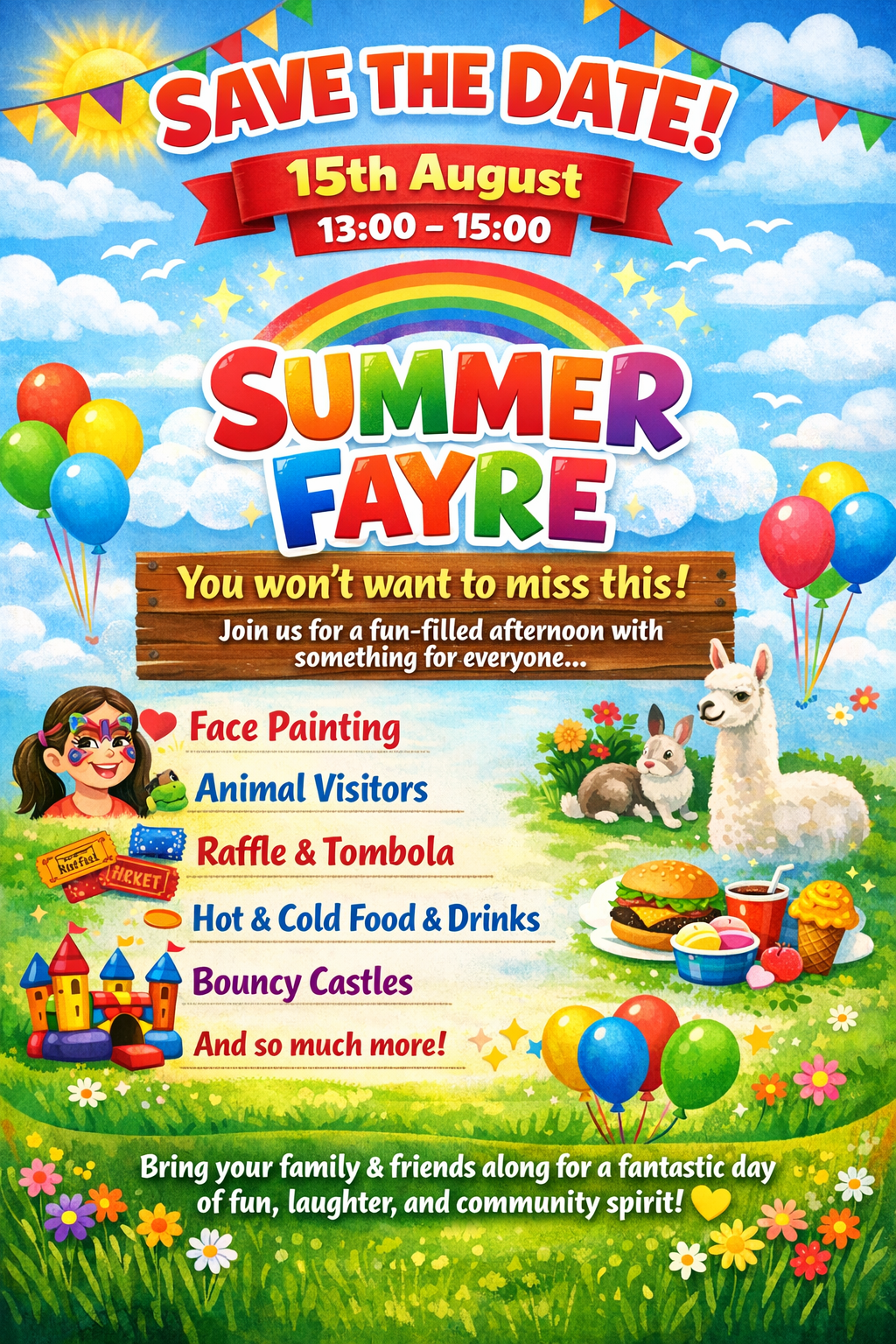 We are delighted to announce that our highly anticipated Summer Fayre will be taking place on Saturday, 15th August, from 13:00 to 15:00.